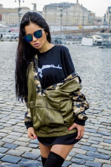 - Anorak is a practically dimensionless windbreaker, as it has a very loose silhouette. It is important that the armholes of the sleeves be in place, and the sleeves themselves - slightly cover the upper part of the palm. Herself the jacket should be about half the length of the thigh.