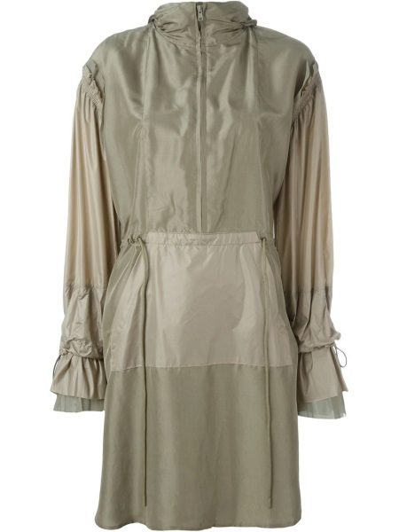 Unusual anorak cloak made of khaki silk. A fitted feminine silhouette, graceful decor - this model is a great example of how sportswear can be feminine and elegant.