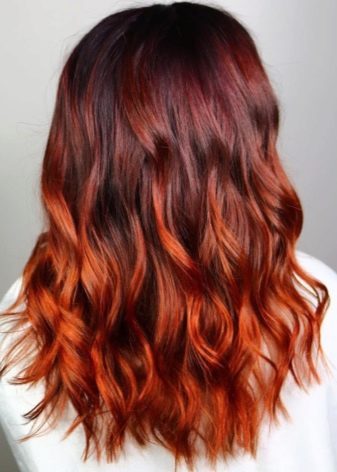Among the expressive tones for balayazh, you can pick up red colors, which will turn out to be a good addition to chestnut or black curls. In this case, the master can perform a full dye of the hair in copper or red, or highlight only the ends with a contrasting color.