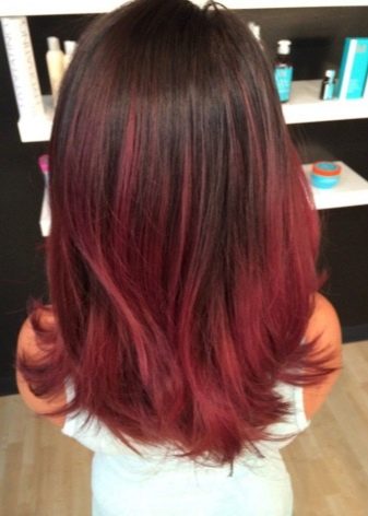 - Brown hair can be beautifully distinguished when using burgundy or cherry balayazh. Ideas with juicy colors will be appropriate both for emphasis on the ends of the hair, and for working with curls along the entire length