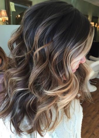 To shade and highlight dark curls, hairdressers offer a combination of strands with white, light brown or beige. Such options will add shimmering shine to the hair. Such options will add shimmering shine to the hair. The main thing is to observe the technology of smooth flow of colors when choosing light colors for brown and black hairso that the hut is gradient and as concise as possible. In this case, an image is created of deliberately careless overgrown light strands throughout the hair volume or in certain layers of the hairstyle, depending on the haircut.