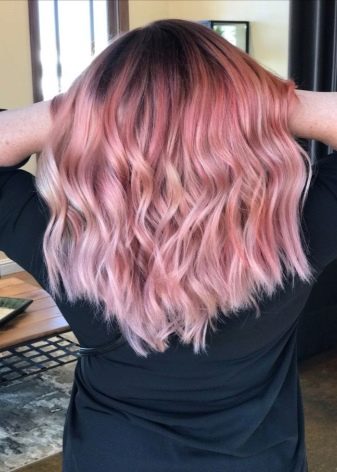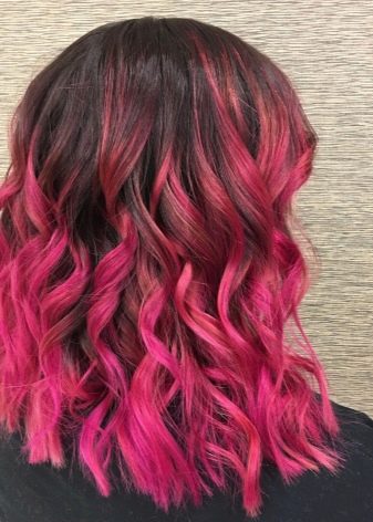 Among the modern trendy options for balayazha, the use of pink color, which looks great on dark curls to the shoulders or on even haircuts with a straight cut of hair, is very popular among young people.