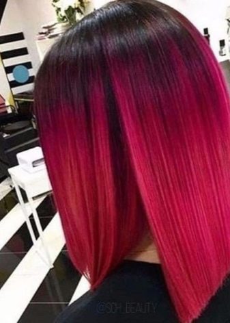 Today, the extended haircut of a square for dark hair is quite popular. To give a new look to this image with the help of stools in the style of a hut, you can use a bright and ultramodern pink shade. This option will look beautiful on the radically black hair of the girls of autumn and spring color types, giving the image depth with the help of small curls. In addition, the trendy pink balayazh will become the highlight of the image on the hair of the brown-haired woman with perfectly even curls with a smooth transition of color.