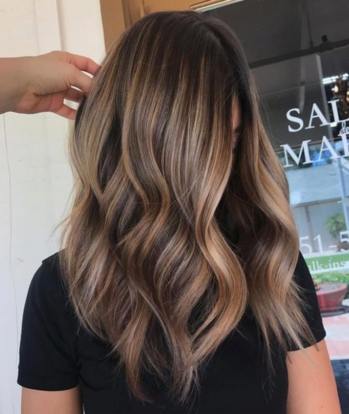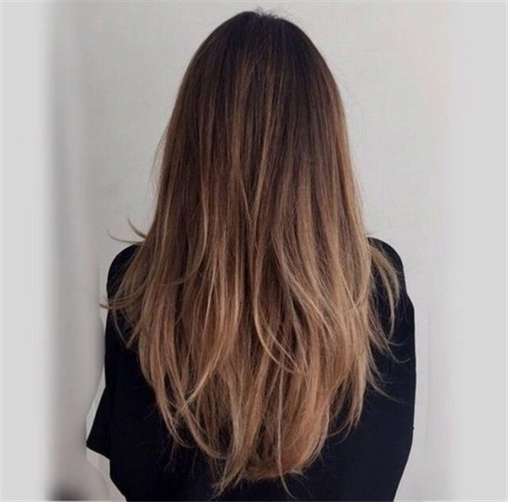 To give shine and expressiveness to dark brown hair below the shoulder blades, a good option would be to use additional cold straw and white shades. Light strands from the middle of the length will add a splendor to the hair, while highlighting the eyes and giving the image of freshness will be possible with lightened strands framing the face, which may differ in tone from the ends.