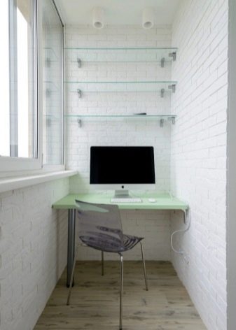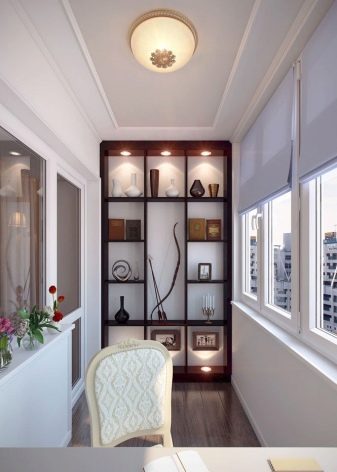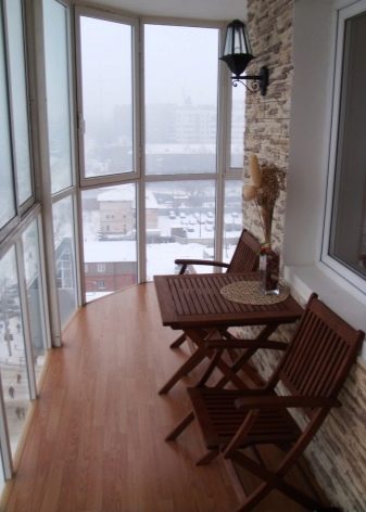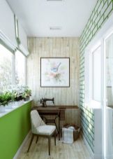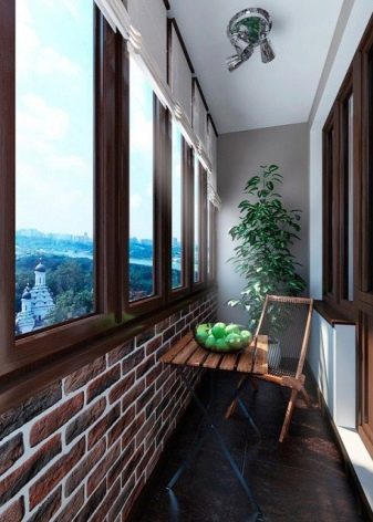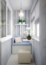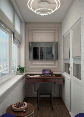 If you like a neoclassical trend, You can combine white with pale peach, light purple or muted yellow. The decor may have a turquoise, pink or lavender tone. Finishing these styles is usually done with decorative plaster. It can also be used stone, artificial white brick, soft leather panels. If the balcony is properly insulated, wall decoration is acceptable.