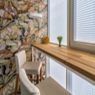 - Very cozy, light Scandinavian balcony. The solution with a bar counter is simple in execution, but it is this simplicity that does not violate the lightness of the interior. All pieces of furniture are in harmony with each other, decoration and mood of the room.