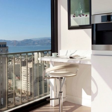 - In the photo, what is commonly called the “modern interior”. The perfection of lines, materials, as well as the organization of space in its purest form. If the glass of your balcony offers an equally impressive view, you certainly will not lose with the arrangement of the bar counter.