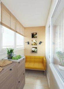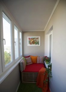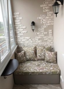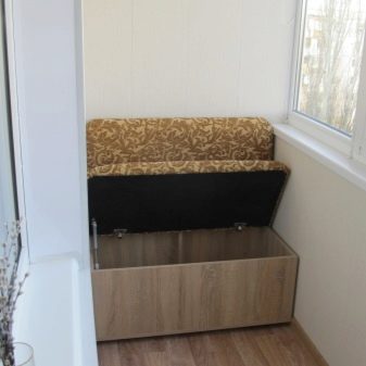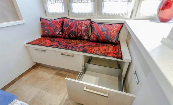 - A small sofa with built-in drawers perfectly complements the loggia and does not take up much space. Bright pillows will decorate and complement the interior.