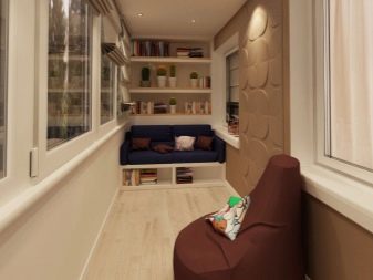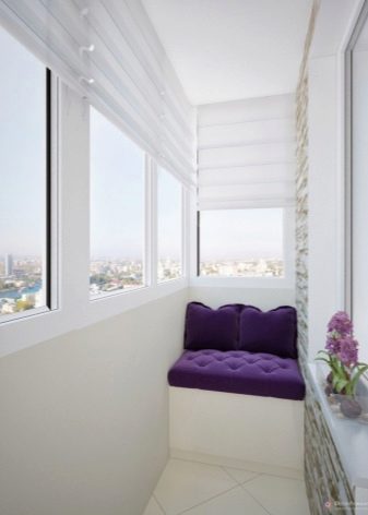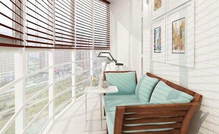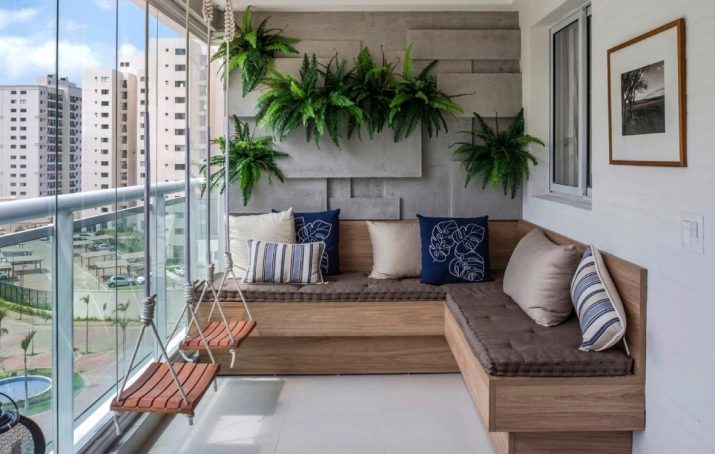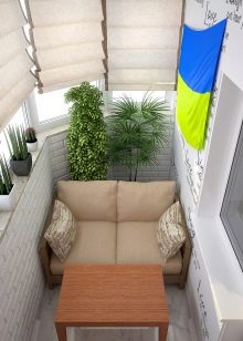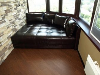 On a rectangular balcony, you can install a straight or corner sofa. As a rule, it is placed near one of the walls, which makes the room more spacious. You can set a mini-option for the width of the room.