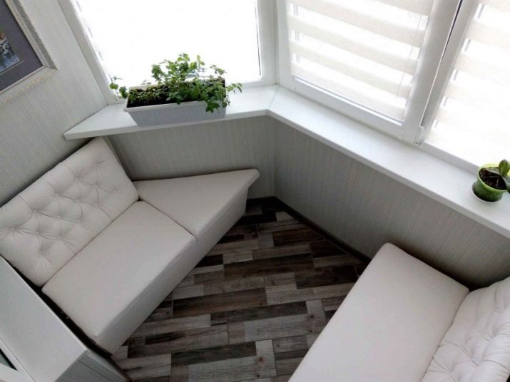 - Angular. It is believed that such models are suitable exclusively for spacious rooms.However, this design can be installed on a narrow balcony. The main thing is not to make a mistake with the size of the furniture. Corner mini-sofas will be comfortable and original additions to the loggia.