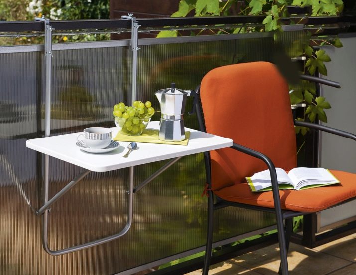 - A cross between a hinged and hinged structure using plastic and metal. A light, airy table looks great on the balcony, sheathed in plexiglass. The structure is easy to clean and easy to carry.