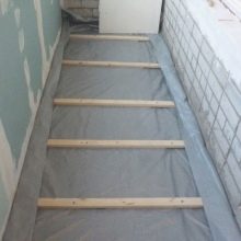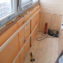 For the installation of the crate, wooden logs are used. They are fixed to the base of the balcony floor with anchors and form small cells for the subsequent installation of heat-insulating material.