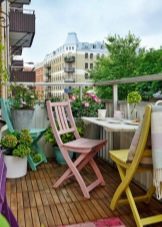 - The flower garden on the balcony is already a voluminous decor. Therefore, if it is adjacent to large furniture, you get a visual overload. Shod, transparent, through furniture is well combined with greens. If you have a plastic table and chairs, this is quite an option for the warm season.