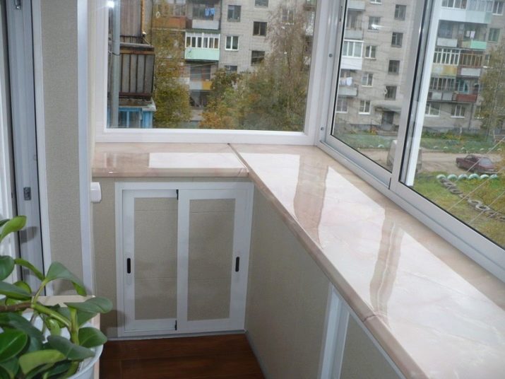- But from the inside, the increase in size is noticeably about a third. Under the wider windowsill, you can install additional cabinets for storing various accessories.