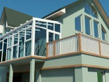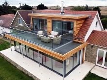 In the installation of a roof-type balcony extension, an opening is created in the roof itself, doors or a doorway are mounted.They create side walls, insulate the attic floor, waterproof it, then pull it together. The balcony window has sashes, one of which is a railing, and the other serves as a visor. Due to the hinges, the lower leaf can make translational movements or be fixed in a predetermined position.