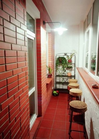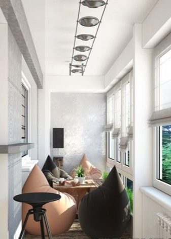 Metal ceiling fixtures are often mounted roughly on the ceiling or special tires are laid in which the plinths move and can change the direction of light - this will help create an acceptable mood. This factor is extremely important in cases where the balcony is in demand at different times of the day, no matter what quality it is - for work or for relaxation.