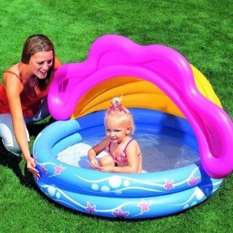 Comfortable, safe pool option. Represents a design with a roof that protects from the scorching sun. Sitting in the tank, active movements are not possible here. Kids have a great time using the visor option. Suitable for summer cottages, beach. The design can be installed anywhere, since there is no need to look for a shadow. Similar products come in various configurations. There are patterns adorned with varied decor.For example, a tower where the roof is a visor.
