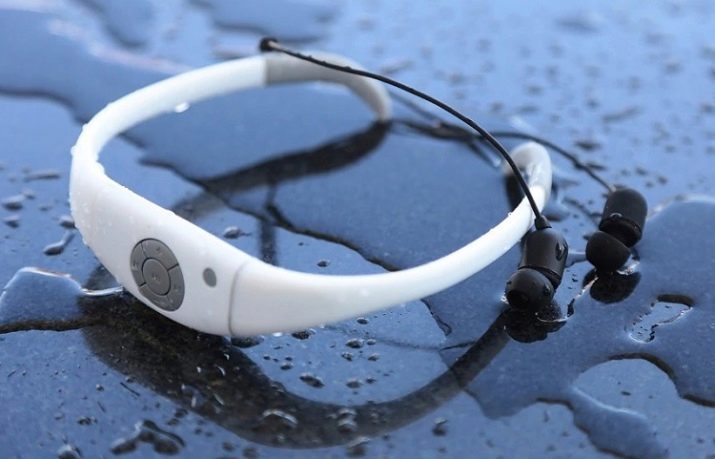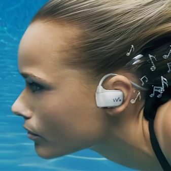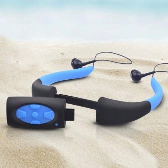 For lovers of water sports and professional swimmers, waterproof players have been developed for listening to music. Outwardly, they practically do not differ from standard models, but still have some features. They are equipped with a metal case and rubber control buttons. There is a mount for fixing on glasses or on the head, as well as a case with a strap for fastening to a hand.