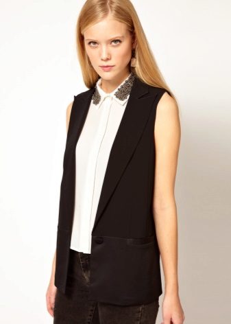 Denim blazers can also be presented with sleeveless models, for example a black blazer with welt pockets and rhinestones as a decor.