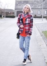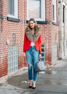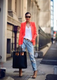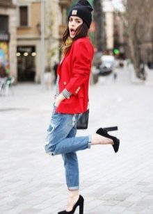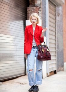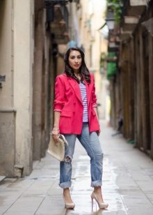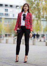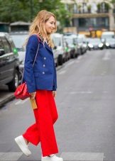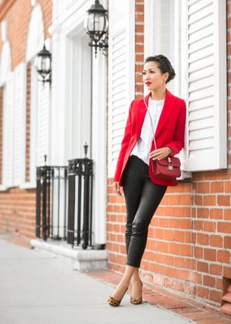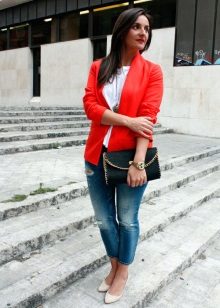A red blazer will also be good in everyday looks, in a tandem with simple jeans and a t-shirt or blouse. Since red is combined with many colors, it is very difficult to make a mistake.. But nevertheless it is better to choose gentle, pastel shades, so as not to overdo it and not to make the image vulgar.