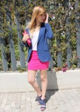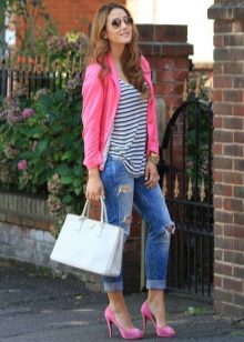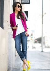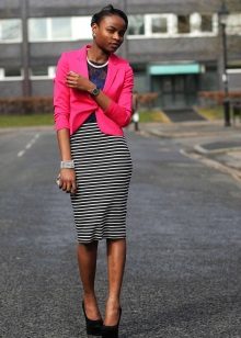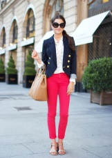 If you're afraid to go too far, combine a pink blazer with clothes in black and white. For example, he complemented a monochrome image in a black and white strip, making it bright and interesting.