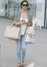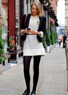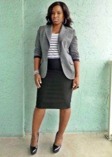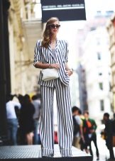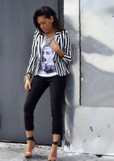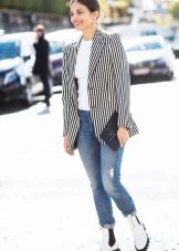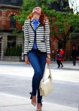 The striped blazer will not only dilute the solid look, but also make your silhouette slimmer. To do this, give preference to thin vertical stripes that visually stretch the silhouette.