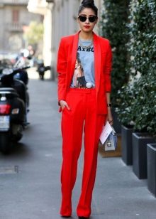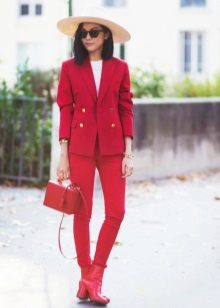 Red total look will help out in a situation where you need to look especially chic. Refuse the banal skirt in favor of fashionable red trousers.