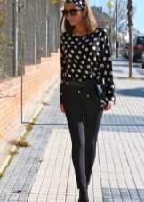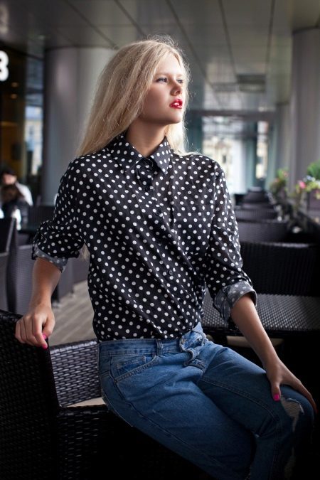 Blouses of black color with white polka dots can be sewn from light satin, silk or chiffon. This element of the wardrobe will help to decorate a stylish bow, make a variety and appeal.