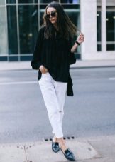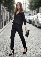 The classic black blouse is represented by a strict cut, so it should be worn with a strict bottom - trousers or a straight cut skirt. You can wear a jacket or cardigan over your blouse. In the cold season, dark tights are ideal for a skirt. When choosing shoes, you can opt for varnish boats with a small heel. This outfit is perfect for office style.