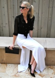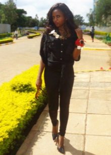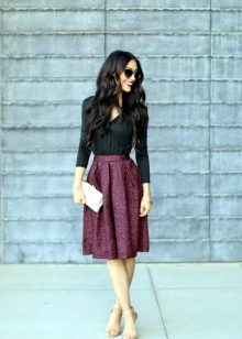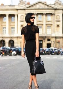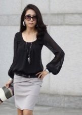 Often there is a combination of a black blouse with a black skirt. Such an ensemble can be decorated with clothing items of other colors. You can wear a blue or beige jacket over the blouse. An elegant belt can be represented in different colors, but you should avoid brown and black. A bright handbag or a stylish scarf will become a bright accent, but it is important to remember that all accessories must have a print or accessories in black, then the image will look harmonious.