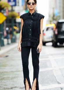 A black sleeveless blouse is perfect for embodying a feminine look. It can be decorated with ruffles or bows. It should be combined with a pencil skirt or skinny pants.