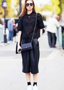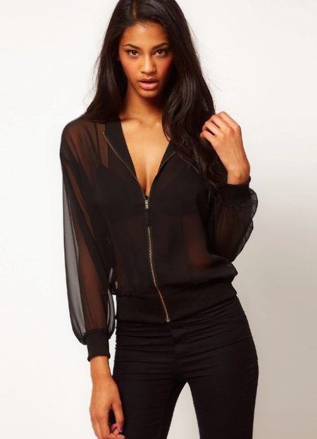 A black blouse made of translucent fabric with a zipper and a V-neck is ideal for embodying a fashionable, sexy look. The style of the blouse resembles the cut of a sports sweatshirt, which gives the product riddles and originality. Elegant linen under the blouse attracts the attention of others. This model looks perfect with black trousers. When choosing shoes, you should give preference to models with flat soles.