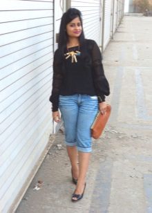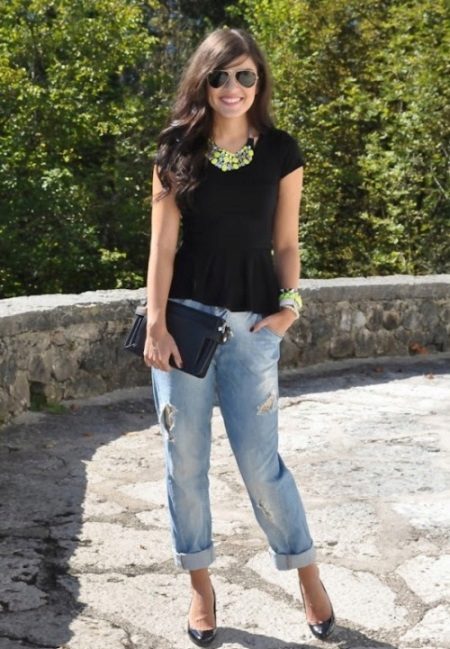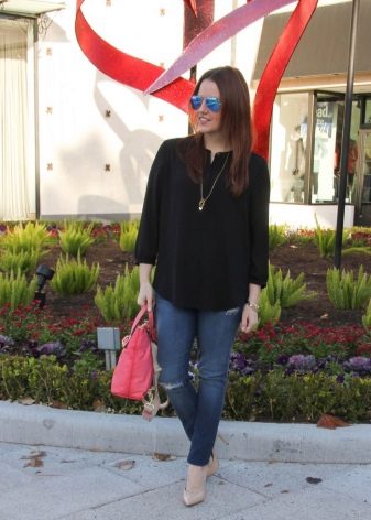 For a stylish casual look, a black blouse ensemble with jeans, boyfriends with scuffs and holes will be perfect. Blouse with an asymmetric hem looks bold and bright. A short sleeve and a round neckline are perfect for the summer season. The image will help to complement a fashionable clutch and stilettos in the tone of a blouse. Decorations of a gentle green shade can become a bright accent.