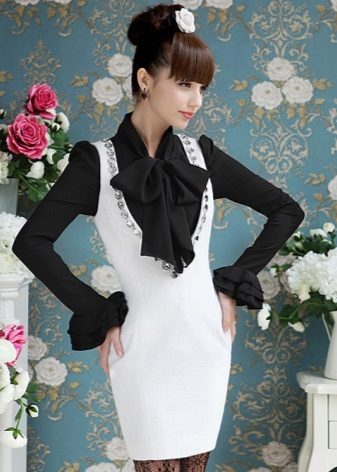 A black blouse is often adorned with a luxurious bow on the front. This model is ideal for study or work. This item looks beautiful in tandem with romantic wardrobe elements. The bow can be white or red, which gives the model originality and creativity.