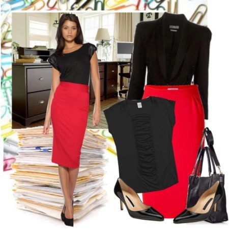 The combination of red and black looks bright, beautiful and bold. With a black fitted blouse with short sleeves, you can wear a red pencil skirt with a high waist. Heeled shoes with a pointed toe in the tone of a blouse, a small handbag will perfectly complement an elegant bow.