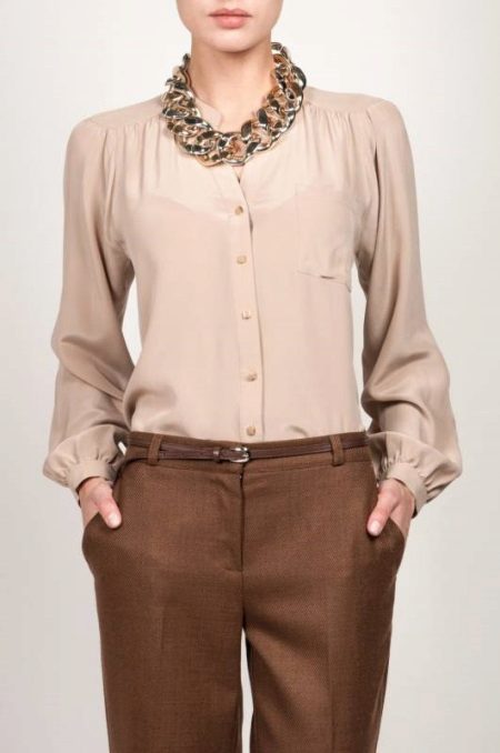 Does the beige long sleeve blouse look boring? Take a closer look at her! Unfasten a couple of top buttons, try on a massive necklace, and tuck your shirt into classic straight fit trousers with a high rise. Such an image will organically look in the office and you will be the most stylish.