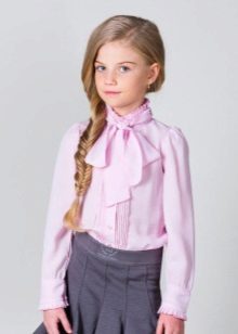 - Blouse with a tie or bow. It occupies an intermediate version between blouses made in a classic and romantic style. The only decoration of this model is a bow or a neat tie, tied from a narrow strip of fabric sewn to the collar. Such models are very often made of polyester, so they do not wrinkle and are ideal for girls of middle and senior school age.