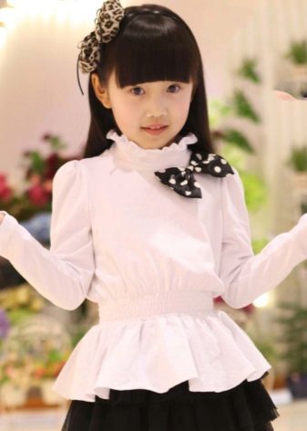 An elegant and practical option for the youngest students: a white blouse of a shirt cut goes well with a trapezoid skirt or flared sundress. As a decoration, a voluminous black bow-collar bow is chosen. The sleeve of the blouse can be long or short.