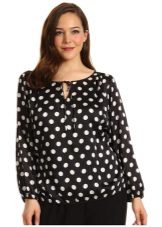 Polka dots - an original, but at the same time simple print that looks very attractive, and most importantly - does not complete the figure. Full girls are ideally suited with a blouse in small peas in combination with a plain bottom.