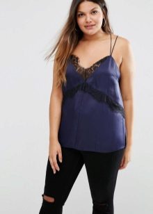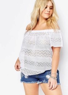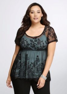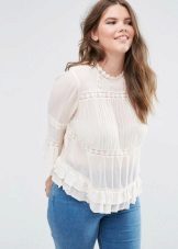 - Lacy and guipure. Lace blouses always look very elegant and feminine, no matter what clothes you wear them with. Due to the variety of styles, you can choose the right option for any type of figure. Combined blouses with lace inserts, which help to correctly place accents, are suitable for full girls.
