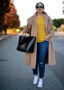 Thanks to clear lines and a vertical row of buttons in front, the silhouette looks more slim. A fold-over collar and a pair of unbuttoned buttons form a V-neckline that suits girls with any type of figure. Also pay attention to the stand-up collar, which is ideal for short ladies.