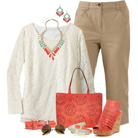 Great summer look for every day. Light, light trousers and a white guipure blouse look very easy and fresh. Complement the look of wedge sandals and a coral-colored bulk bag. Pay attention to details that help to correctly place accents - jewelry, a belt and stylish sunglasses.