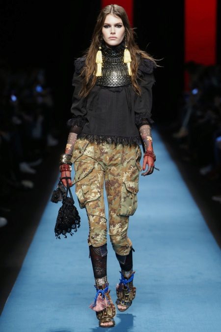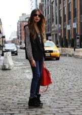 - Urban fashion: a printed blouse harmoniously looks complete with skinny blue jeans and a long sleeveless jacket. The image is complemented by a large red bag, heavy boots and sunglasses.