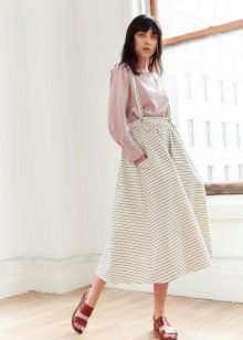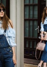- Eclectic style: a romantic, light blue blouse unexpectedly effectively combines with a simple denim overalls, fashionable beige and pink slip-on sneakers and a matching bag.