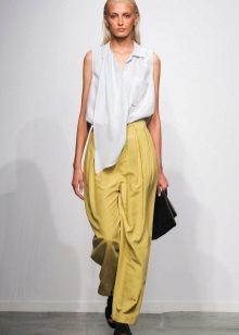 - Juicy shades: a loose yellow long-sleeve blouse is effectively combined with cropped trousers decorated with a green print, white high-heeled sandals and a bright necklace.