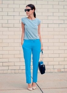 Pants combined with cobalt will create a casual look. A metal belt will help to add completeness to the image.