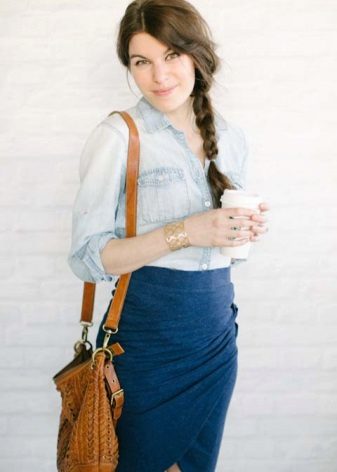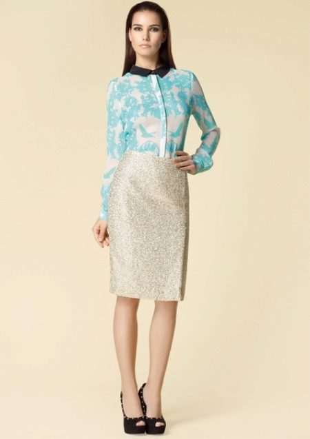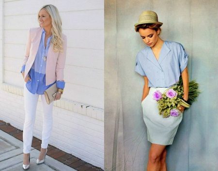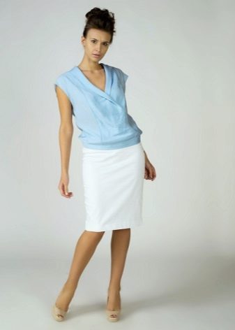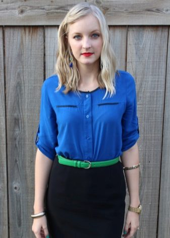 To create an office style, you do not have to choose a classic blouse. You can wear a white pencil skirt and a blue blouse overhaul. Wear a belt to emphasize your waistline. It is better if it is in mint or light green shades. Add a matching bracelet to the strap and beige open-toe shoes.