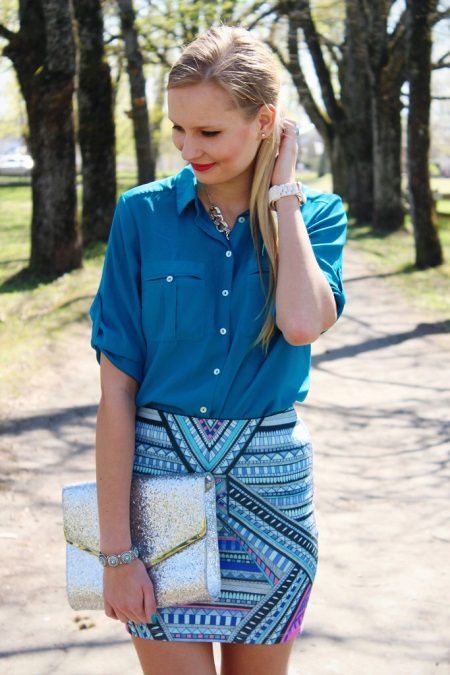 Dilute a blue body shirt with short sleeves in a duet with a skirt with a geometric print in a golden color bag. As accessories, choose jewelry "in gold".