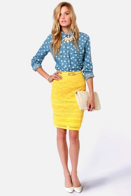 A blue polka dot blouse is best worn with a plain bottom. For example, a polka dot shirt in combination with a yellow guipure skirt.