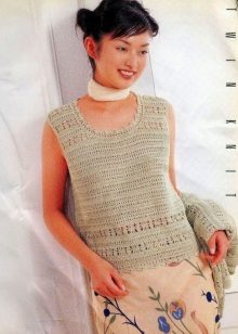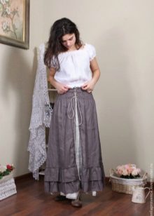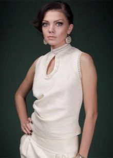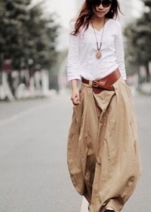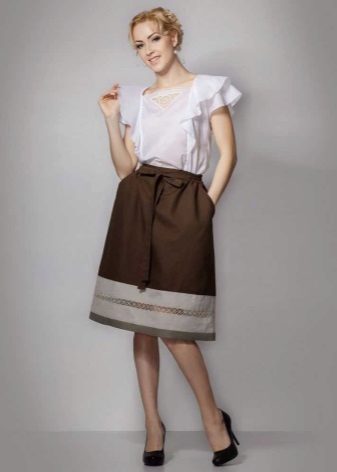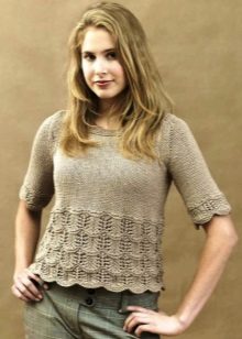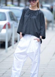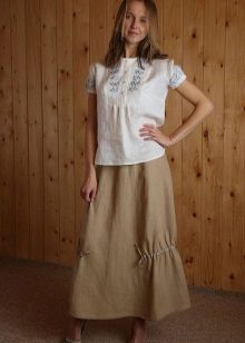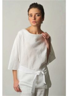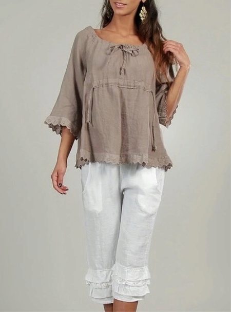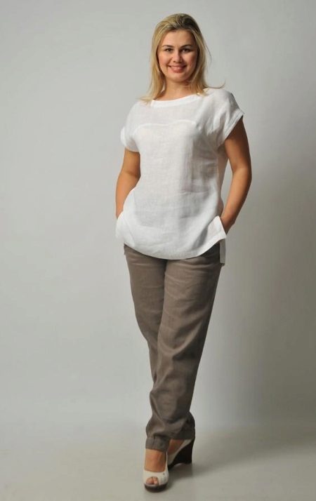 A light summer linen blouse with a boat collar and a spectacularly lowered shoulder line is successfully complemented by brown linen trousers with an elastic band below. IN Such an outfit will not be hot even in the heat, and a straight cut blouse will hide the minor flaws of the figure.